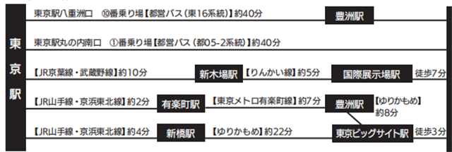 ·從東京站八重洲口的「乘車點(diǎn) [都營巴士 (東 16 系)]」乘車,約 40 分鐘可到豐洲站;